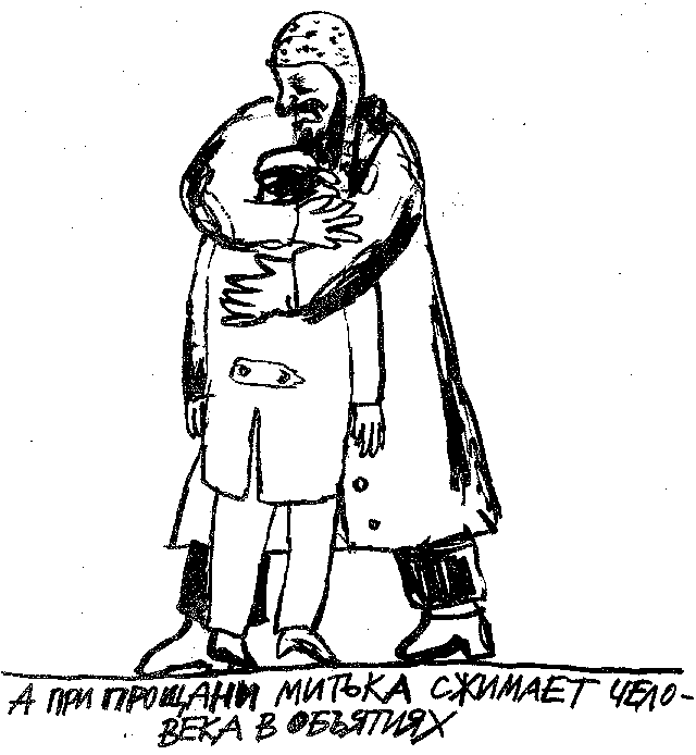 На лице митька чередуются два аффектированно поданных выражения: граничащая с идиотизмом ласковость и сентиментальное уныние. Bcе его движения и интонации хоть и очень ласковы, но энергичны, поэтому митек всегда кажется навеселе. Вообще всякое жизненное проявление митька максимально выражено, так что употребляемое им слово или выражение может звучать как нечленораздельный рев, при этом лицо его остается таким же умильным.
