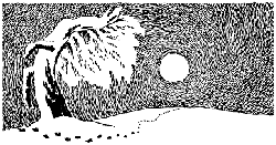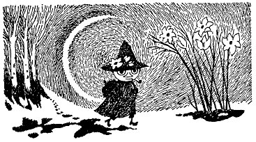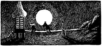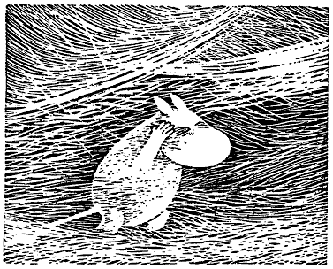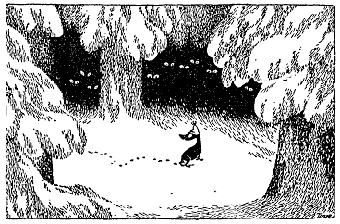 Хныча и спотыкаясь, побрел Муми-тролль по снежному полю, и внезапно на него нахлынул жуткий страх перед мраком и одиночеством. Страх этот, должно быть, таился где-то с тех самых пор, как Муми-тролль проснулся в спящем доме, но только теперь он дал ему волю.