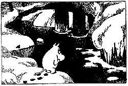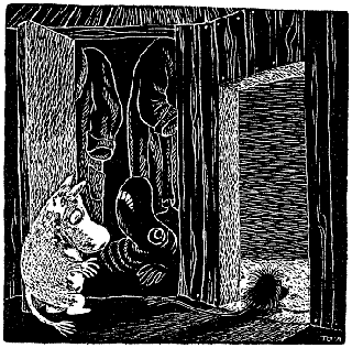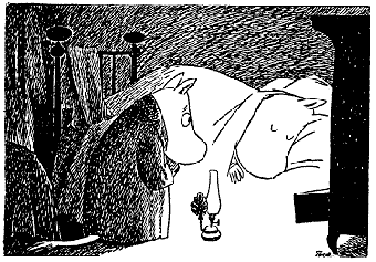 Внезапно Муми-тролль остановился в теплом сумрачном углу, куда не проникал лунный свет, и ему стало страшно. Он вдруг почувствовал себя ужасно одиноким и покинутым.