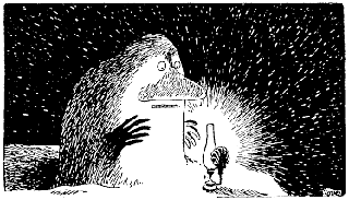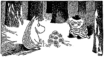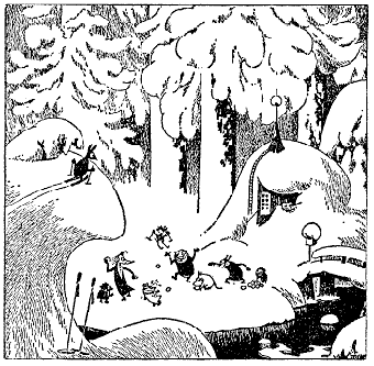 "Весь мир погрузился в зимнюю спячку, -- подумал Муми-тролль. -- Один я тут брожу и никак не могу заснуть. Я один буду брести и брести без конца все дни и все недели напролет, пока сам не превращусь в сугроб, о котором никто даже знать не знает".