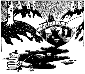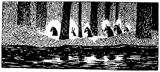 С трудом пробираясь сквозь снежные сугробы, Муми-тролль подошел к реке. Той самой прозрачной речушке, что так весело бежала летом по саду семьи муми-троллей. Но теперь она казалась совсем иной - черной и равнодушной. Река тоже принадлежала к тому новому миру, где Муми-тролль чувствовал себя чужим.