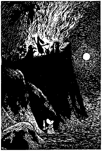 Только теперь Муми-тролль начал мерзнуть по-настоящему. Вечерняя мгла наползала из ущелья и медленно взбиралась на оцепеневшие от холода гребни гор. Там, наверху, словно острые белые зубы на черной скале, лежал снег. И повсюду, насколько хватал глаз, лишь белое да черное, пустота да одиночество.
