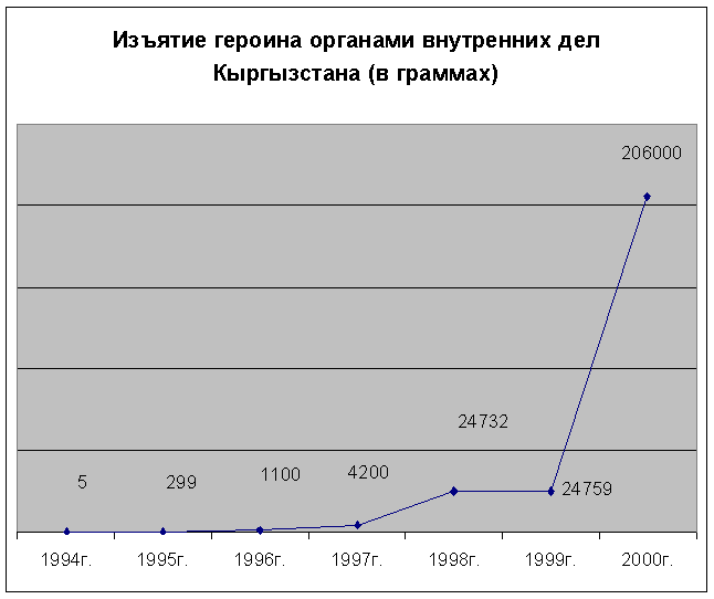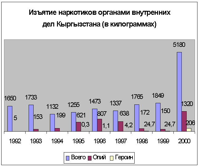 Afghanistan. Community Drug Profile #1. Problem Drug Use in Afghan Communities: An Initial Assessment. // UNDCP Afghanistan Programme. Drug Demand Reduction Support (AFG/C29). Islamabad. September 1999. Administration has introduced Islamic Movement of Uzbekistan to the list of international terrorist organizations. // New York Times.-2000.-15.09 The Reuter Library Report.-1994. Russian Federation Ministry of Foreign Affairs news briefing. Official Kremlin International News Broadcast. English transcript by Federal Information Systems Corp. - 1996. Afghan Mujahideen Publications //URL: http://www.payamemujahid.com International Narcotics Control Strategy Report. // Washington. March 1999. Drug War Politics. The Price of Denial. //University of California. Press. 1996. Rethinking International Drug Control: New Directions for US Policy. //New York: Council on Foreign Relations. 1997. Afghanistan: Annual Opium Poppy Survey 1999//UNOCP Regional Office, Islamabad, 1999. A. Rashid. The Taliban: Exporting Extremism. //Foreign Affairs. 1999. Statistics and Analysis on Supply of and Trafficking in Narcotic Drugs and Psychotropic Substances. // Vienna. 1996. World Drug Report// UNDCP. Oxford University. Press. 1997. Economic and Social Consequences of Drug Abuse and Illicit Trafficking // UNDCP. Vienna. 1996. Global Report on Crime and Justice// UNOCCP. New York. 1999. Would Kyrgyzstan Become Opium Wars. // Kyrgyzstan Chronicle. No 34. 1994. Colombia, Bolivia, Peru ... Kyrgyzstan?!. // Kyrgyzstan. No 1. 1994. Organized Crime in Four Countries. The Opium War in Central Asia. // Materials of the 12th International Congress in Criminology: Crime and Justice in the Changing World: Asian and Global Perspectives. Seoul. South Korea. 1998. Golden Sub-region. // Materials of the International Scientific-Practical Conference: Strengthening of Combating against Organized Crime in Central Asia. Bishkek. Kyrgyzstan. September 1998. Analysis of the Present Narco-situation and it's trends in the Central Asian Sub-region. // Materials of the International Conference: Non-Governmental Organizations in Drug-Abusing Prevention. Bishkek. Kyrgyzstan. October 1998. Report of the Incidence of Crime among Refugees and Illegal Migrants in the Kyrgyz Republic (1993-1997). // UN High Commissioner of Refugees and International Organization for Migration. Offices for Central Asia. Bishkek. Kyrgyzstan. 1998. Analysis of the narco-situation in the area of the UN Anti-drug Project "Osh knot" activity. // Bishkek. Kyrgyzstan. 1999. Golden Sub-region (Analysis and forecast of drug situation development in the Central Asian sub-region). // Crime and Criminology at the turn on the XXI century. The XII International Baltic Criminological Seminar. June 28-30, 1999. St-Petersburg. Russia. 1999. The Golden Crescent narco-trail. // International Police Review. Issue 17. January - February 2000. London. UK Anti-Drug Efforts of I.R. of IRAN in 1996. // Drug Control Headquarters. TEHRAN-1997. Opium production in Afghanistan reaches record level. // UPDATE. United Nations Office for Drug Control and Crime Prevention. United Nations publication. Austria. October 1999. Project Document Strengthening Law Enforcement Capacities and Cross-Border Cooperation in the Central Asian Subregion (Kyrgyzstan - Tadjikistan - Uzbekistan). AD/RER/96/B88. UNDCP project AD\RER\97-C32 Mapping the extent of illicit cultivation in Kazakhstan - Kyrgyzstan - Tadjikistan. // Annual Tri-partite Review Meeting. December 1, 1998. IRAN: PRODUCERS SHOULD BE TARGETED IN FIGHT AGAINST DRUGS - PROSECUTOR-GENERAL. // Internet. March 2, 1999. Three soldiers for each kilometer of border. // Internet. May 31, 1999. The border is on lock and general Totsky holds the key to it. // Internet. May 28, 1999. Uzbek protest at Afghan drugs. // Internet. August 1, 1998. Tadjikistan: committees work on fighting drugs "unsatisfactory" - Prosecutor-General. // Internet. March 30, 1999. 33. UN: Tadjik President opens Crime Commission meeting. // Internet. April 28, 1999.