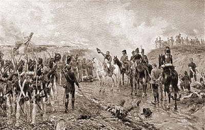Уже с конца ночи Наполеон был на месте, но он не мог начать атаку на рассвете, потому что прошедший дождь так разрыхлил землю, что трудно было развернуть кавалерию. Император объехал утром свои войска и был в восторге от оказанного ему приема: это был совсем исключительный порыв массового энтузиазма, не виданного в таких размерах со времен Аустерлица. Этот смотр, которому суждено было быть последним смотром армии в жизни Наполеона, произвел на него и на всех присутствующих неизгладимое впечатление.