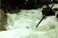 Повреждения: Две согнутые поперечины у ката Кирилла и Сереги, сломанная кница левого баллона третьей поперечины и погнутая в этом месте продолина у "Хавроньи". При разборе полетов были сделаны выводы, что в стабильном состоянии (нахождение Гули с катом в улове у левого берега под "Прощай Родина") не следует хватать первую попавшуюся морковку (которая может оказаться и без карабина) а ждать стопроцентного шанса. С параллельной группой возникли некоторые трения по поводу, что мы всей группой сняли страховку у "Прощай Родина" и ушли в догонку за перевернувшимся катом, создав тем самым трудности в прохождении порога их группе, четверка которой также ушла за Гулей. В наше оправдание можно привести доводы о том, что положение параллельной группы было конечно тяжелым, но не критическим, в отличии от нас, учитывая, что Гулю унесло в каньон и никакой информации о ней мы не располагали. Причем, учитывая далеко не нулевую вероятность оверкиля, в "Сосновом" нам могли понадобится все наши суда. 5 мая. Подъем в 7:00. Вышли в 10:19. До начала каньона "Малый Блып", заканчивающимся порогом "Щель" около 10-12 минут ЧХВ. Ориентир начала каньона - река делает правый, а затем крутой левый поворот, перед правым поворотом - входом в каньон у левого берега обломок скалы пиромидальной формы и завал плавника. Дорога подходит к реке и хорошо видна с воды. Через 150 м. крутой правый поворот с прижимом к скальному выступу и косой бочкой у левого берега. Проходили по внутренней стороне поворота, заходя у правого берега. Далее следует технический участок с маневрами между камней. На выходе из Каньона русло сужается и реку перегораживает бочка. Слева проносной язык, справа пенный котел. Кирилл с Серегой опять залегли. Кирилл зацепился за кат и его вынесло из бочки, Сергей остался полоскаться. Единственное, что мы успели это уйти чуть влево и упали в бочку гадая, не раздавили ли Сергея. Когда мы прошли бочку и я оглянулся назад у меня внутри все похолодело - Сергея в бочке не было. Правда спустя секунду я увидел его плывущего чуть правее нас. После выхода из "Щели" участок спокойной воды. Волков благополучно добрался вплавь (кролем) до берега, выпустив при этом весло, которое было поймано нашим катом. После поимки Серегиного весла мы и подоспевший Макс занялись спасением катамарана с Кириллом.Однако затолкать кат и плавающего рядом человека в улово не удалось. Кирилл был взят на борт (скорее на раму) двойки, а перевернутый кат был передан подоспевшей четверке. Кирилл был высажен на берег, а двойка и каяк ушли вдогонку за четверкой и перевернутым катом. Но, как оказалось, они и сами люди взрослые и, когда мы подошли, двойка уже была загнанна в улово (11:50). У девичьей двойки при прохождении каньона порвался упор и им пришлось зачалиться в середине каньона. Их ждали около часа (починить упор им помогали Макс с Лехой). в 12:50 отплыли дальше. До автомобильного моста (ориентир начала "Соленых скал" 10 минут ЧХВ. По дороге есть места для стоянок. Чалка за