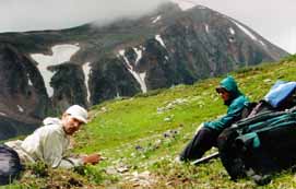 Перед спуском с перевала вниз навстречу нам с радостными криками выбежали люди. Люди кричали по-аглицки. Наше мнение о том, что мы забрались в полную глушь, очередной раз сильно пошатнулось. Люди оказались голландцами. Мы сфотографировались с ними на память, обменялись E-mail адресами, пообещали друг другу выслать фотографии (прозвучало международное слово JPEG) и разбежались.