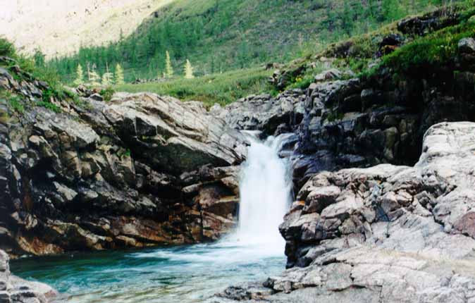 (Д.Г. - Несколько слов о дороге на источники. Это колея, проходящая по склонам гор, иногда по болотинам, а в одном месте - прямо по руслу р. Сенца. Здесь в реку упирается береговая скала. Когда мы шли на Хойто-Гол, вода была высокая, водитель высадил из УРАЛа всех пассажиров, УРАЛ прыгнул с берега в воду и проехал вверх по течению метров 300. Вода при этом перехлестывала через капот и сливалась с лобового стекла. После этого водитель вылез из машины и на вопрос: "Ну как?" ответил: "Все нормально", выпив предварительно стакан архе.)