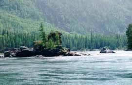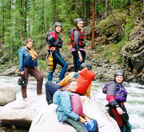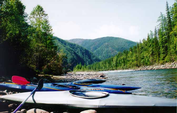Андрей Коваль и Танюша Губанова отрабатывали на страховке очень грамотно и терпеливо. Порой они торчали в улове по часу, ожидая, пока порог пройдут все каяки. Никаких проблем кат нам не создал. Единственный неудачный случай произошел по моей собственной глупости. Я зачалился к кату выше по течению и соответственно чуть не полег (под кат). Кроме того, на кат мы отдали изрядное количество снаряжения и продуктов. Вообще-то мы могли везти все сами (в начале сплава так и было), но разгруженный каяк легче управляется. Кроме того, Митьке и Стасу стало удобнее доставать аппаратуру для съемки.