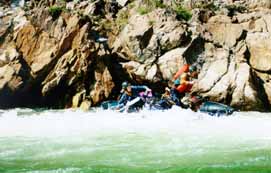 Ребята не рассчитали силу прижима и с трудом прошли вплотную к берегу. Бочка их изрядно тормознула, левый баллон попал в улово и их прижало к скале. Впрочем, от скалы после непродолжительной борьбы они удачно отпихнулись и, траверснув, припарковались с правого берега.
