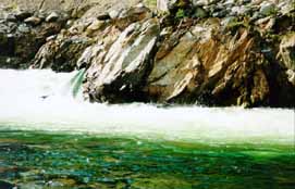 "Бегемот" оказался совершенно неинтересным порогом. Скала посередине реки спокойно проходится справа, после чего очевидный левый поворот и никаких проблем. Ни прижимов, ни бочек. Правда, я умудрился там залечь. Пройдя порог, я смотрел по сторонам (точнее вперед и назад), сплавляясь лагом, весло лежало поперек каяка. В таком положении я заехал на границу улова и тут же полег. Я только успел схватить весло и начать материться по поводу глупого киля. Тут же встал с полным носом (своим, а не каяка) воды (не ожидая такого расклада, зажим я не одевал).