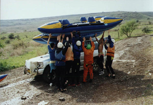 Загружаемся. Кормановскую двойку - на его же машину. Остальные каты - на тендер, одолженный Мишей у проживающего в мошаве владельца (?) велосипедно-прокатной конторы. Грузим так: сначала - четверка килем вниз, под углом 40o к горизонту. На нее, килем кверху - двойку (невероятно, но факт: после получаса езды в таком положении двойка, которая была сверху, сдулась практически до минимальных своих размеров). Получилась эдакая абстрактная композиция под кодовым названием "наш ответ катюшам".