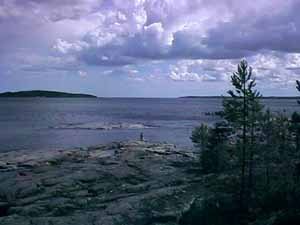 Выбор стоянки - извечная проблема, знакомая каждому, кто хоть раз плавал на байдарке. Давным-давно описаны требования к месту для походного бивуака, включающие и столь экзотическое или даже почти фантастические требования, как "и чтобы никаких комаров!" У нас в ладожском походе были свои рекорды по этой части. Наибольшую привередливость мы проявили, когда собирались делать баньку: нужно, чтобы дров вдоволь, чтобы купальня удобная рядом располагалась, чтобы баньку и купальню разделяло пространство, преодолевая которое выпаренные тела не успевали бы закоченеть.