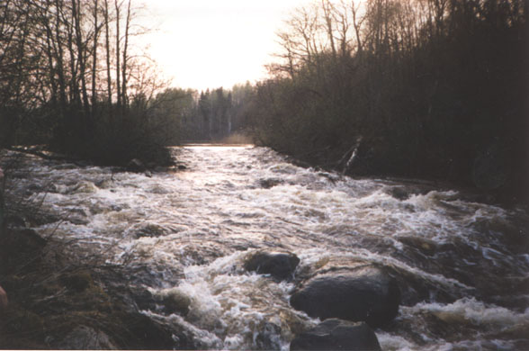 Самое узкое место - между опорами бывшего моста (или плотины)
